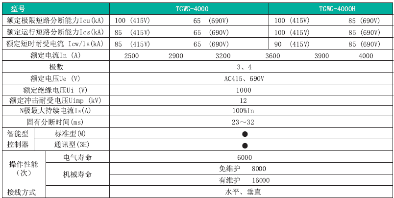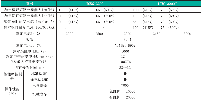 TGWG 系列万能式断路器,适用于交流50Hz,额定电压AC380V~AC690V,额定电流200A~6300A 的配电网络中,用来分配电能和保护线路及电源设备免受过载、短路、欠电压、单相接地或剩余电流等故障的危害。该断路器具有可通信及智能化保护功能,能提高供电可靠性,避免不必要的停电。