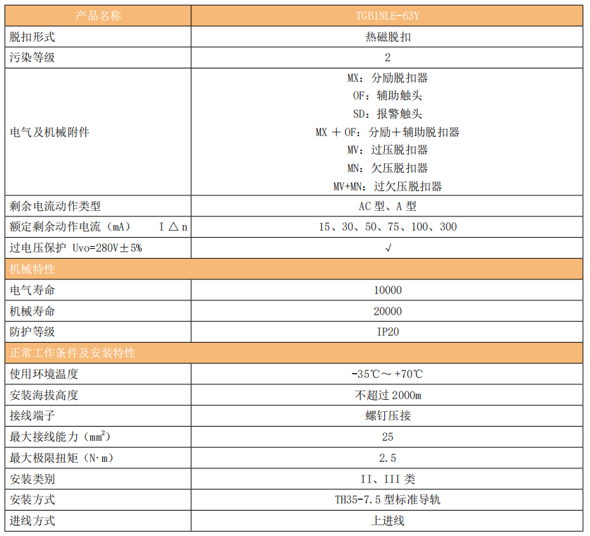 TGB1NLE-63Y 系列剩余电流动作断路器(以下简称漏电断路器)主要适用于交流 50Hz,额定工作电压 230V/400V,额定电流至 63A的线路中,当人身触电或电网泄露电流超过规定值时。剩余电流动作断路器能在极短的时间内迅速切断电源,保护人身及用电设备的安全,并且有过载、短路、过压及在正常情况下作为线路的不频繁转换之用,尤其适用于工业和商业的照明配电系统。
